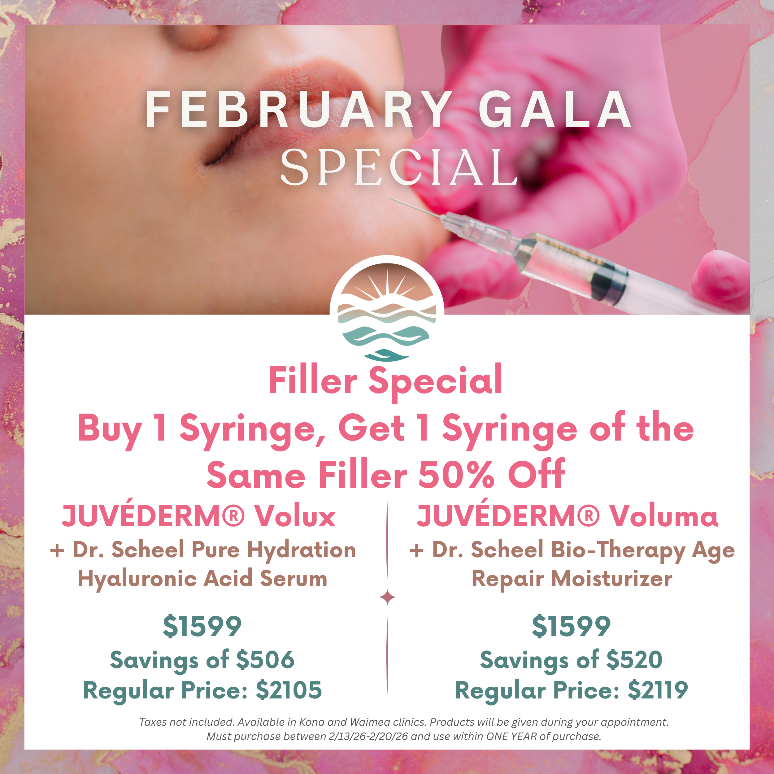 📅 How to redeem: Must purchase between 2/13/26 – 2/20/26 and redeem within ONE YEAR of purchase date. Taxes not included. Products will be given during your appointment. Available in Kona and Waimea clinics.