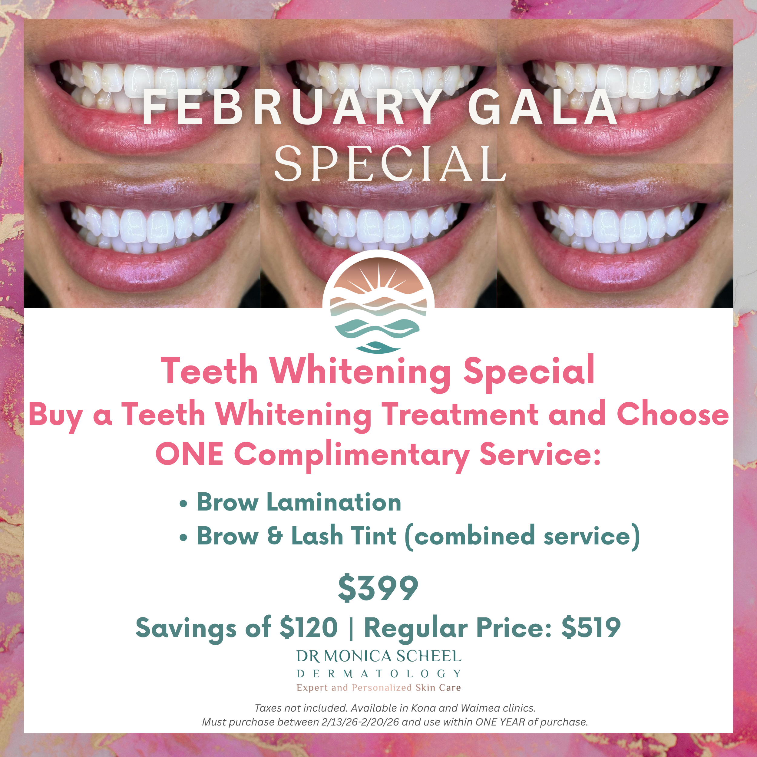 How to redeem: Must purchase between 2/13/26 – 2/20/26 and redeem within ONE YEAR of purchase date. Taxes not included. Available in Kona and Waimea clinics.