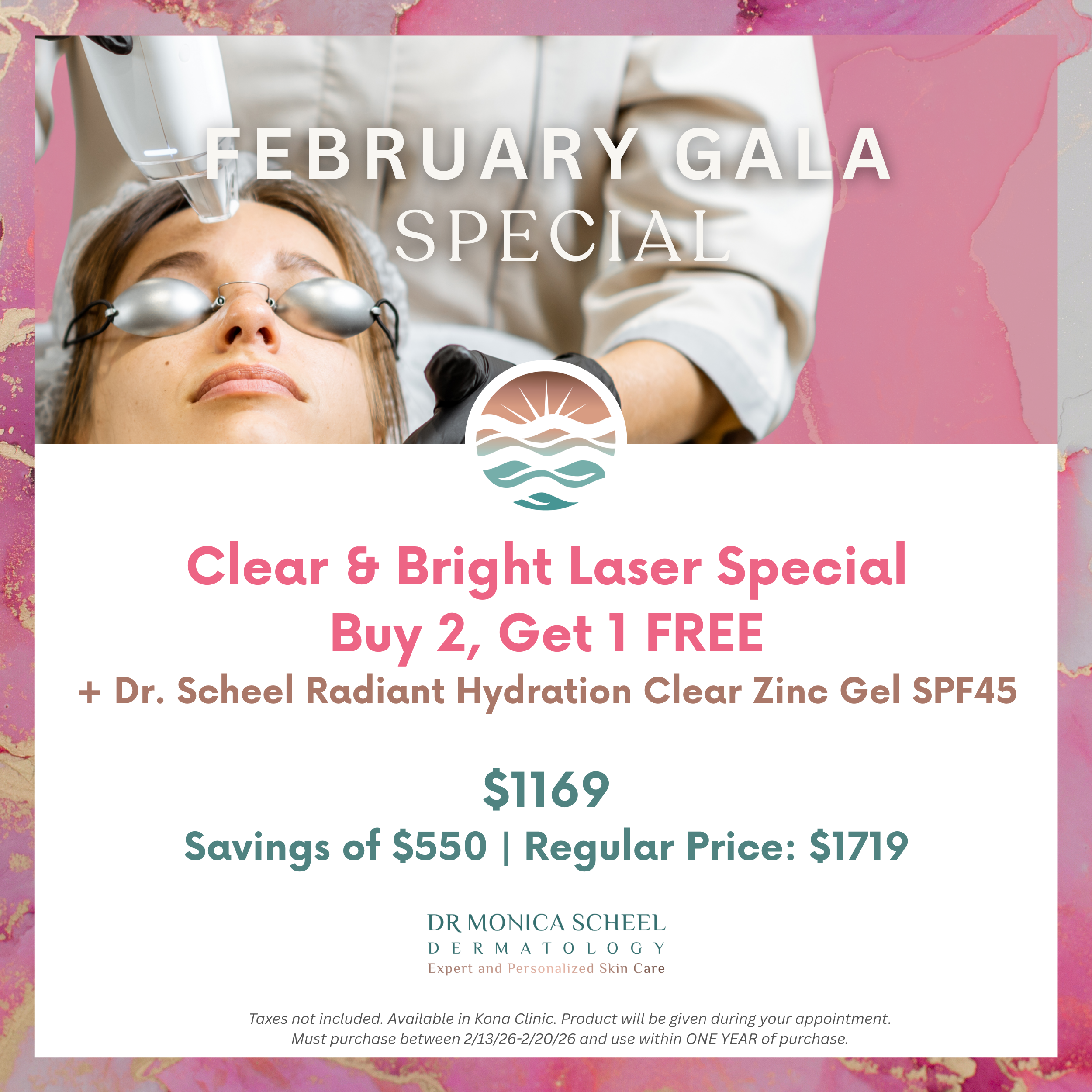 Buy 2 Clear & Bright Treatments, Get 1 FREE + Dr. Scheel Radiant Hydration Clear Zinc Gel SPF45. Clear & Bright available only in Kona clinic.