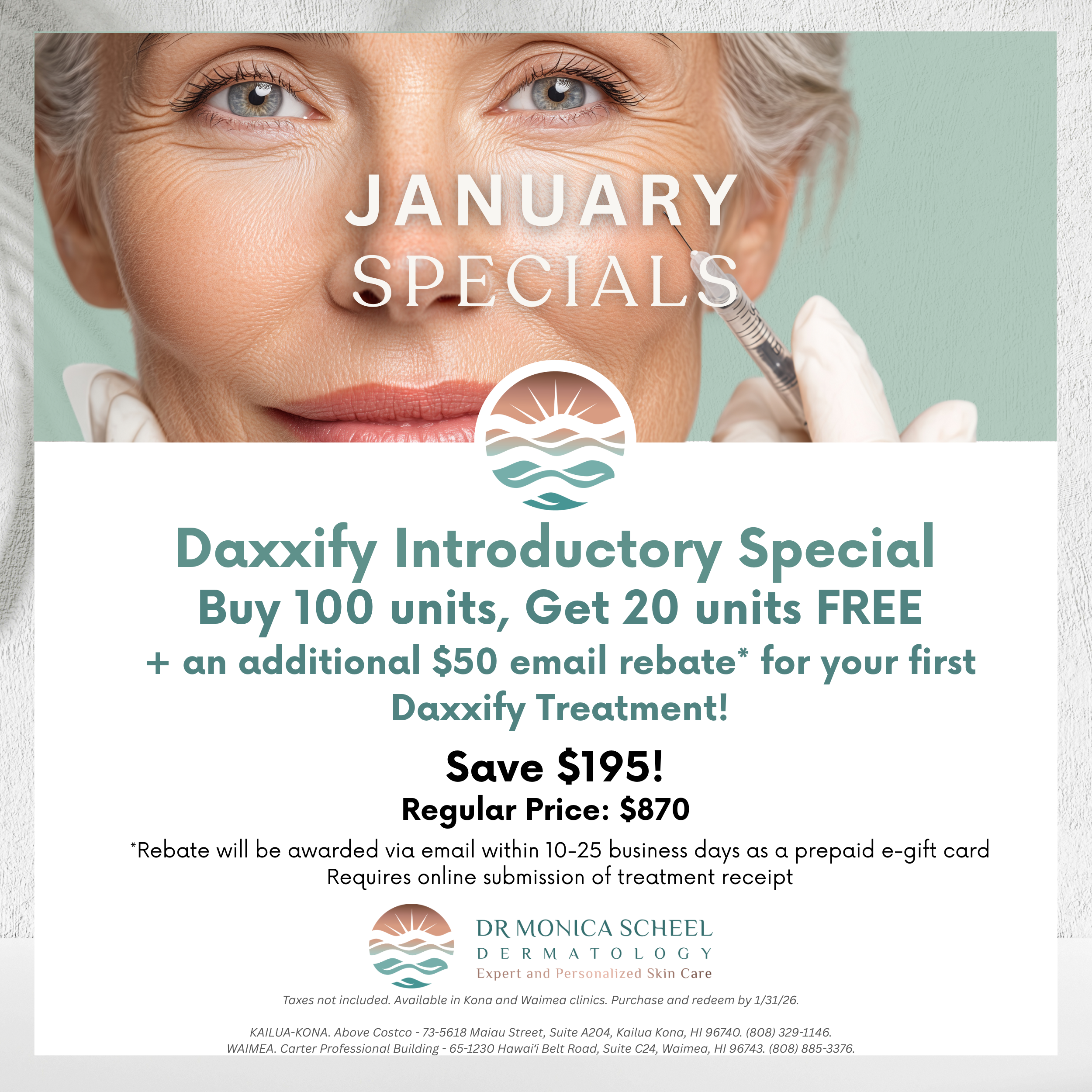 Introducing a new relaxer product at Dr. Monica Scheel Dermatology, buy 100 units, get 20 units FREE! Get an additional $50 email rebate* for your first Daxxify treatment!